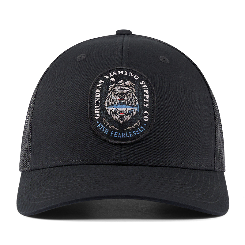Bear Essentials truckerhatt förkroppsligar en naturlig sportfiskares anda med sin bekväma, avslappnade stil och skickliga fiskdödargrafik.