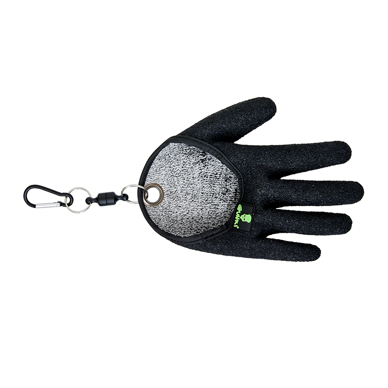 En liten karbinhake gör att handsken enkelt kan fästas i bälte, flytoverall eller väska så att den alltid är nära till hands och inte tappas i vattnet. Finns som både höger- och vänsterhandske, vilket ger bättre passform och säkrare grepp om käft, gällock och beten. Ett enkelt men mycket användbart tillbehör för den som fiskar gädda regelbundet.