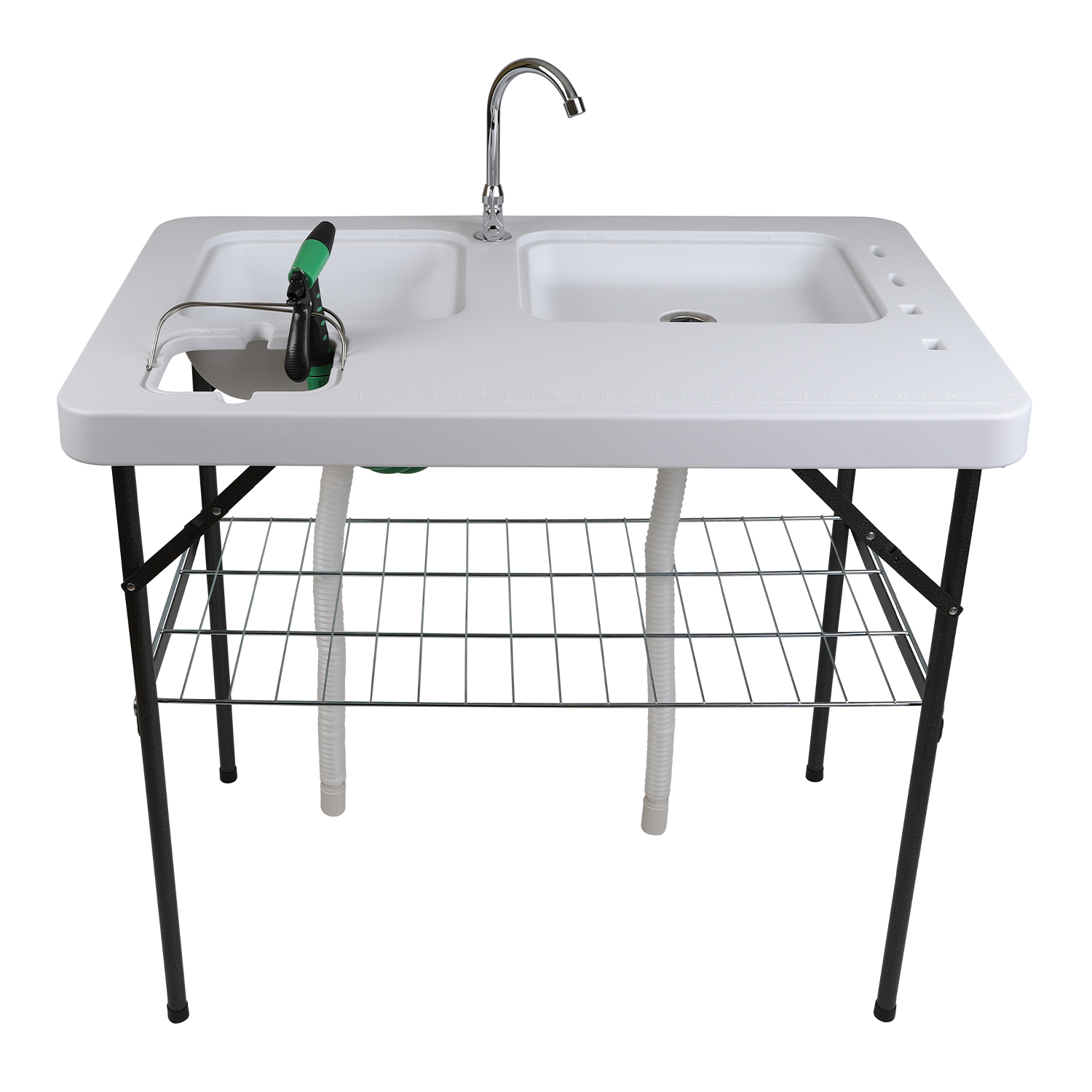 IFISH Arbetsbord är den perfekta följeslagaren på fisketuren och erbjuder en robust, hopfällbar arbetsstation som är perfekt för rengöring av fångsten eller matlagning utomhus. Bordet är tillverkat av slitstark plast och har två rymliga diskhoar med lock, en praktisk kran och en slang med en praktisk Gardena-koppling som säkerställer ett sömlöst vattenflöde. Dessutom erbjuder den praktiska hyllan undertill extra förvaringsutrymme för alla dina fiskeredskap eller matlagningsartiklar. Oavsett om du förbereder färsk fisk vid flodstranden eller lagar en festmåltid i ditt utomhuskök, förbättrar detta bord på 100 cm x 65 cm x 90 cm din utomhusupplevelse.