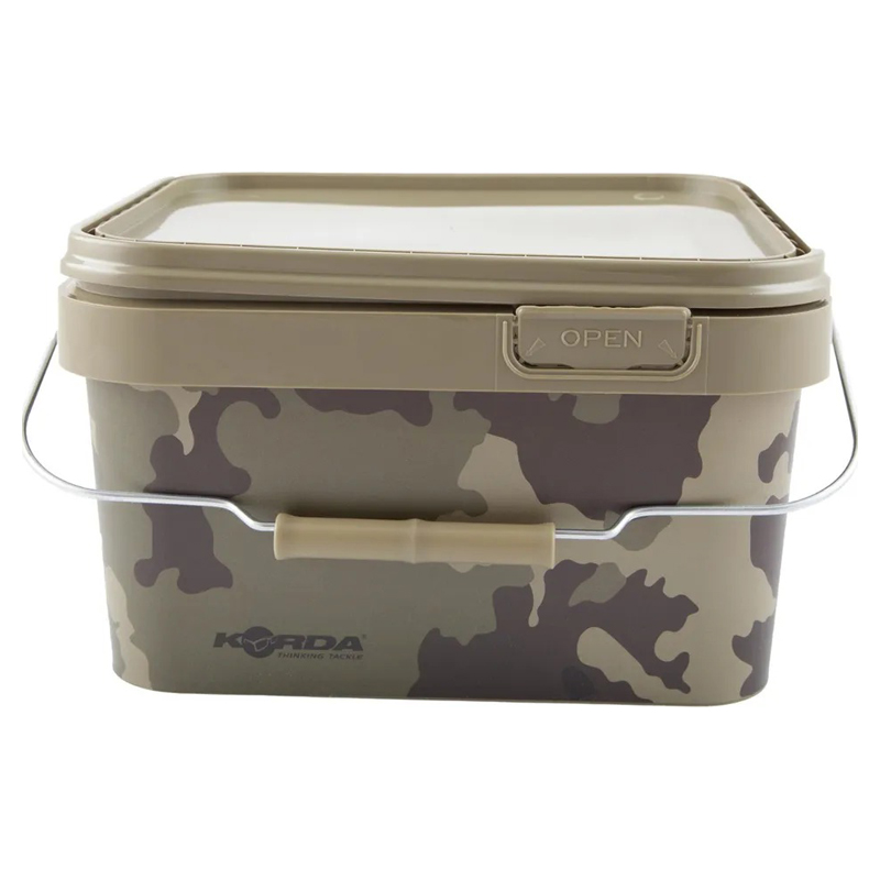 Den fyrkantiga designen gör det enkelt att komma åt allt bete, oavsett om du fyller en Spomb eller en baiting spoon. Locket förhindrar spill och skyddar innehållet mot fukt. Den upphöjda kanten gör att prylar inte rullar av, perfekt som ett tillfälligt bord vid vattnet. Lätt att stapla och transportera tack vare det starka handtaget. Finns i 5L, 10L och 17L för alla behov.